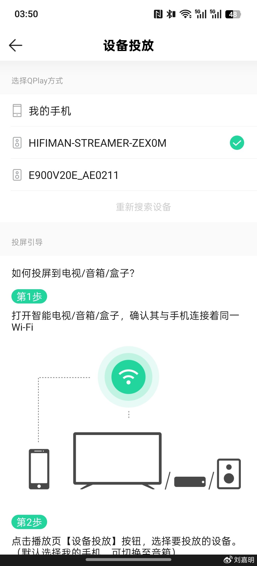 6.再次返回手机“无线局域网”页面,此时“AP-HIFIMAN-STREAMER-XXXXXXXX””已经消失,说明配网成功,此时功能键的LED灯为绿色常亮状态。
