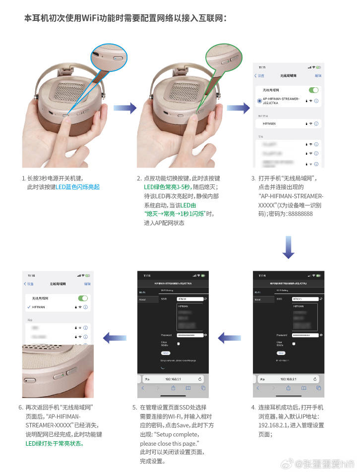 虽然HE1000 WiFi相当于一个迷你版的网播系统,但考虑到耗电量、上手难度等因素,其WiFi接收和操作部分相比台式机器是做了大量的“瘦身”工作的,和流媒体播放无关的部分都被剔除了。在首次使用的时候,要先把手机和耳机相连,在管理设置页面协助耳机接上WiFi网络之后,再通过音乐APP中的设备投放功能进行聆听。只要初次连接成功,之后便会自动匹配了。目前这款耳机和各类音乐APP的适配正在持续优化,如果配套的APP能尽快上线,体验应该还能有进一步提升。这里我找来了官方的操作指导图,大家可以参考一下大致的链接流程。