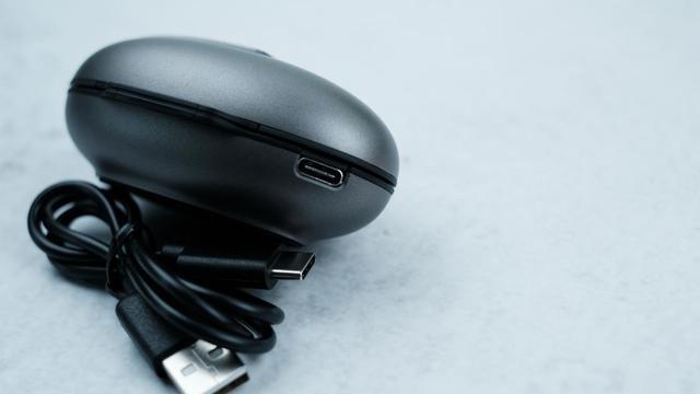 将充电盒打开我们便能看到固定耳塞的凹槽设计以及充电盒剩余电量的灯光显示,前面我们也有提到此次TWS600采用的是更具效率的USB Type-C接口设计,所以其在充电速度方面的表现可谓相当出色。