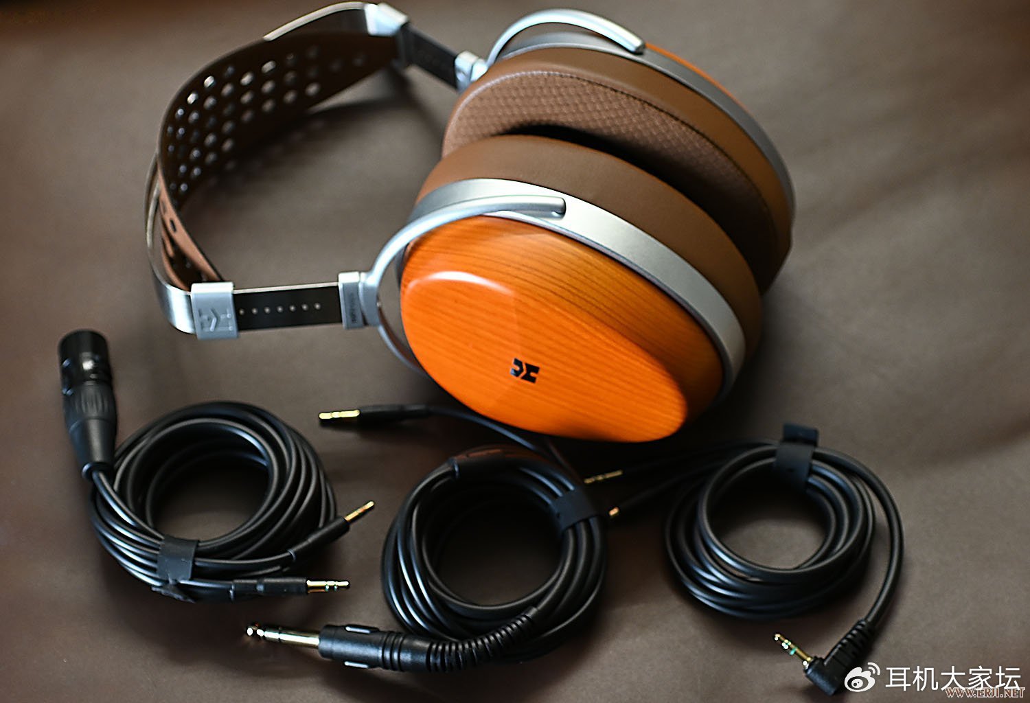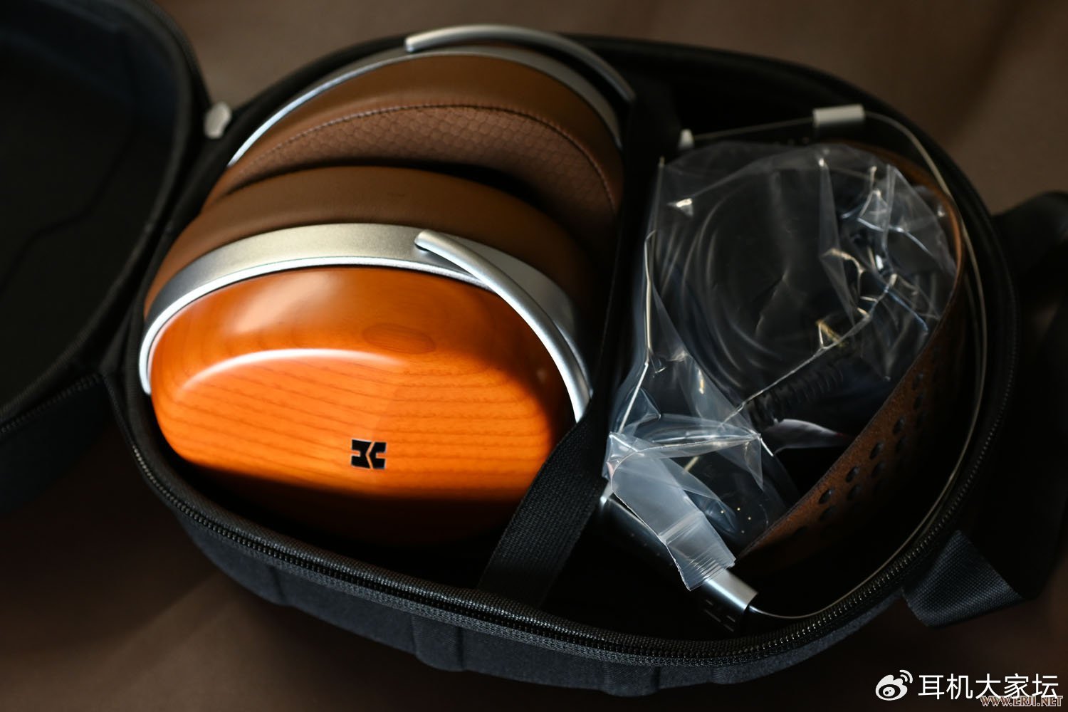 AUDIVINA用的是HIFIMAN高端耳机系列常见的头梁设计,不锈钢+真皮结构,木壳工艺很精致,附件包括三根耳机线(3.5单端、6.35单端、XLR平衡),整体上是HIFIMAN万元级产品的配置。