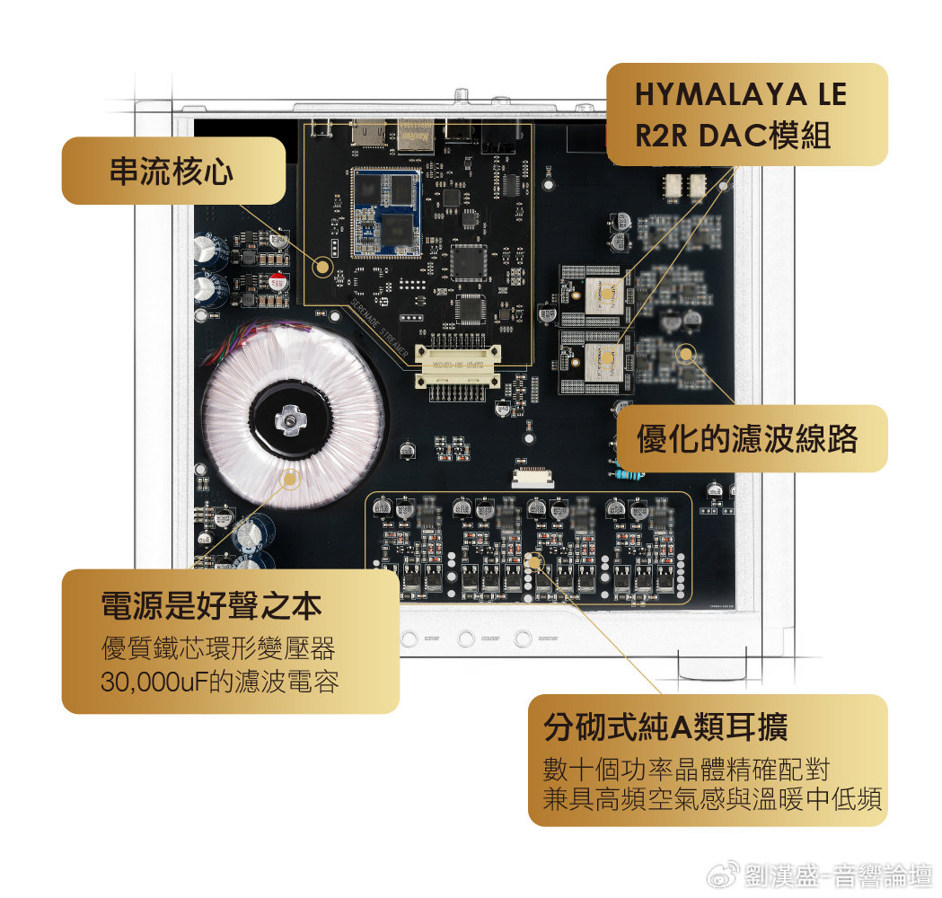Serenade Jr的数字模拟转换部分采用二颗Hymalaya LE R2R DAC芯片,内部没有开关晶体或继电器,而是以自家FPGA算法,加上0.01%精密电阻构成R2R架构。达到THD 0.0025%的规格(标准版0.0015%)。