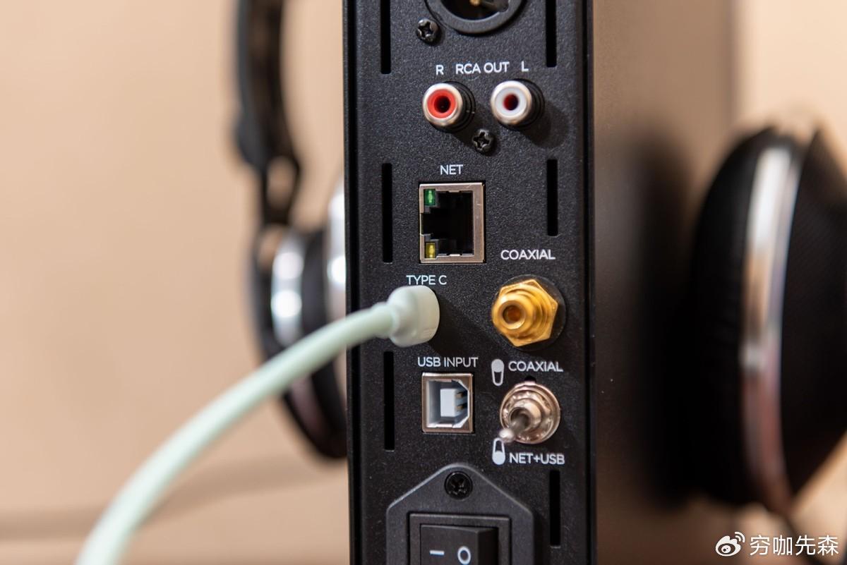 背面的接口相对复杂,上面分别是XLR和RCA的输出口,中间则是用于网络流媒体播放的网线插头,下面就是音频输入口,支持Type-C、USB-B、同轴输入,还有一个输入模式的切换开关,最底部就是电源。