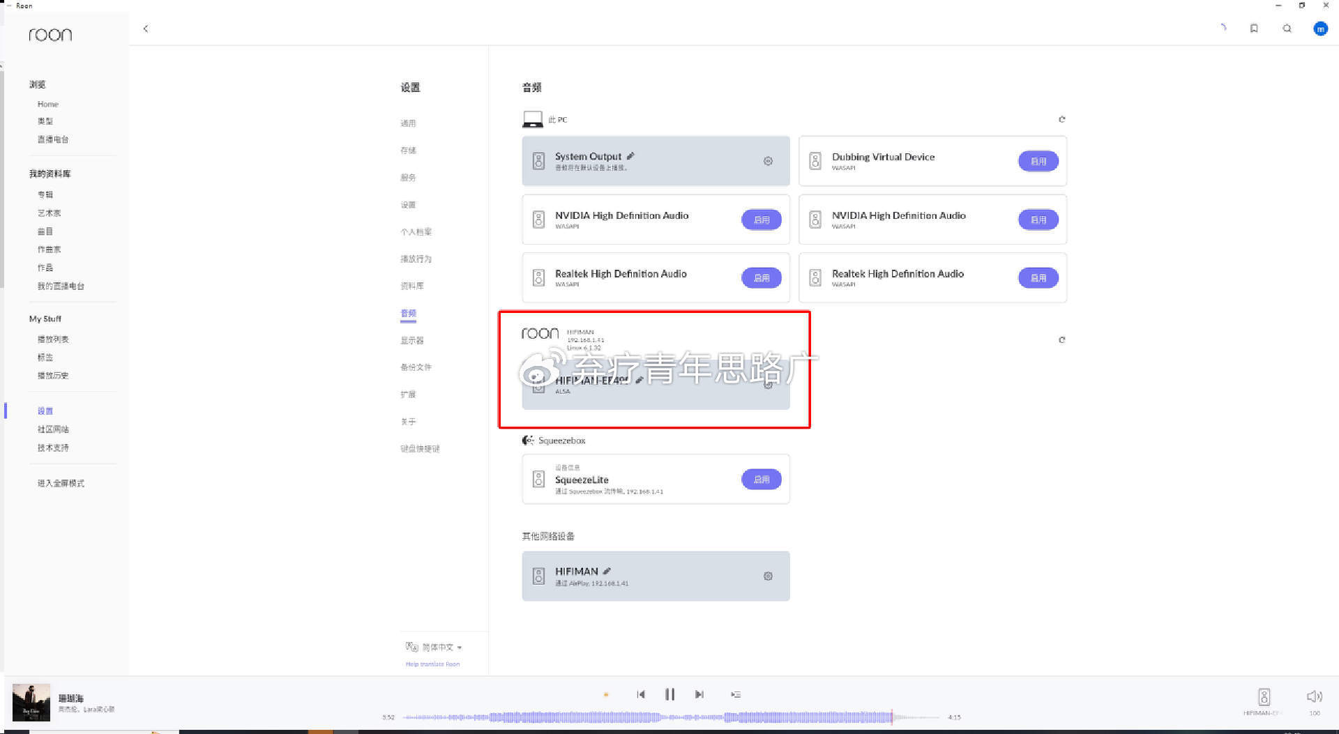 Roon属于一个比较成熟的流媒体音乐播放平台,不管是家中有NAS设备喜欢收集一些无损音乐,还是电脑硬盘里存放了比较经典的曲目集,我们都可以通过这个平台搭配HIFIMAN EF499进行网桥播放,而我们需要做的就是将设备联网之后在NAS设备或者电脑上安装Roon软件,将它设置为Roon核心,就能索引和管理存储在这些设备上的音乐库,然后在音频选项里面就可以看到HIFIMAN EF499,之后再将它作为输出设备并添加选择为默认播放设备,最后我们就可以享受到HIFIMAN EF499所带来的高保真音质体验了。