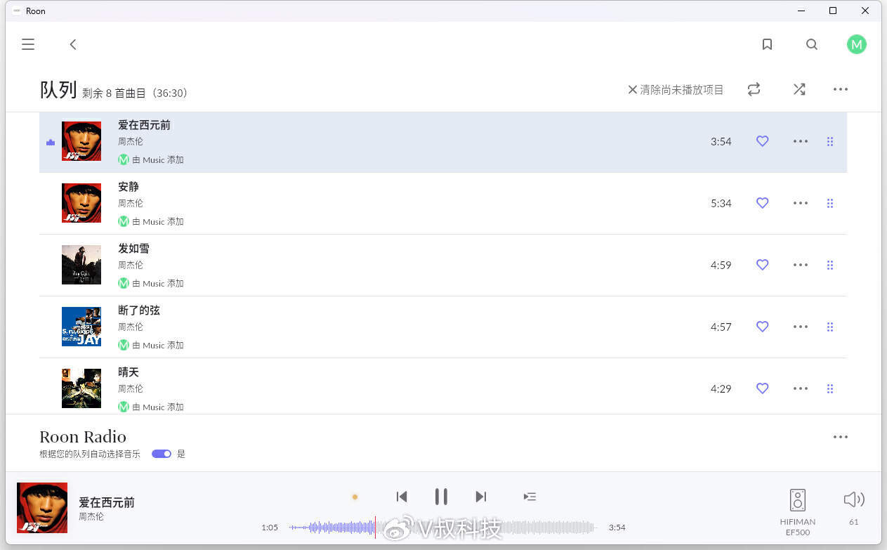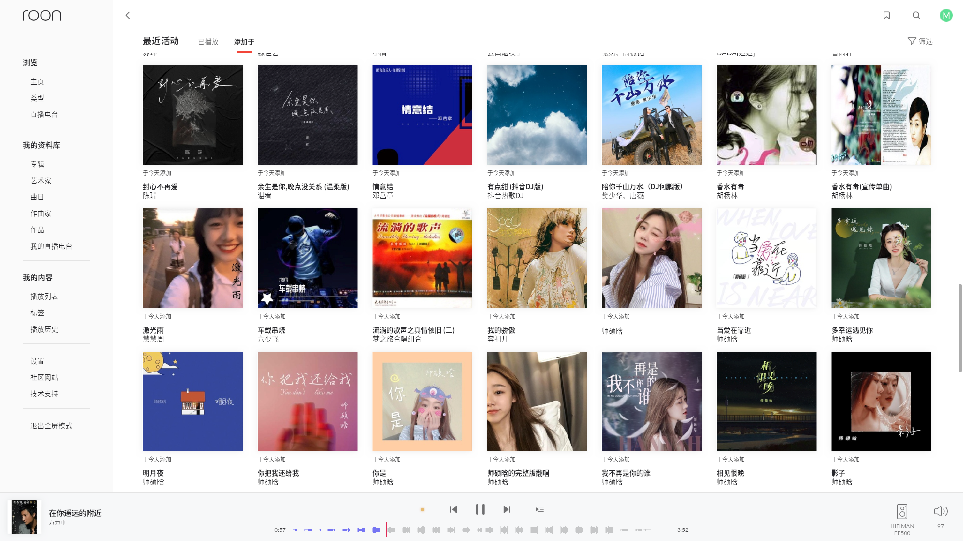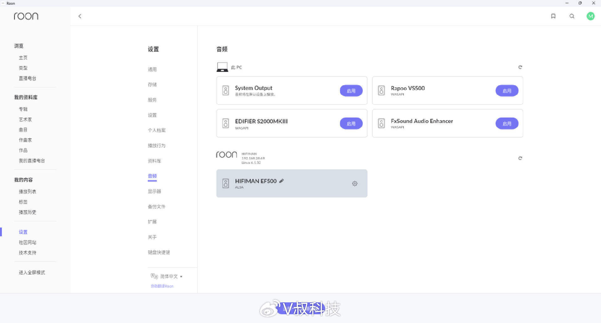 如上图所示,这是ROON应用安装后的界面,以它为例(这个应用是收费的,可以免费体验15天),在PC上安装后,HIFIMAN EF500接入网络和电源开机,然后再ROON端通过简单设置就可以把HIFIMAN EF500当作音频输出设备使用了。