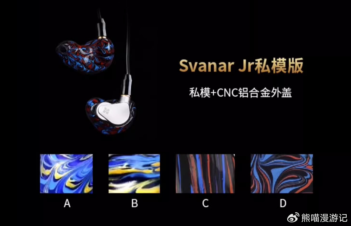 Svanar Jr小天鹅除了公模版外,还有私模版,官方是这么说的,私模版会比普通版高频更好,低频适中,中高频细节、人声清晰度、分离度和声场都有提升,如果你是追求听感更均衡,往素质流靠,熊喵建议你入私模版,私模版也可以从不同彩绘面板中选择喜欢的,熊喵个人挺喜欢彩绘C的风格,看你喜欢那个了。