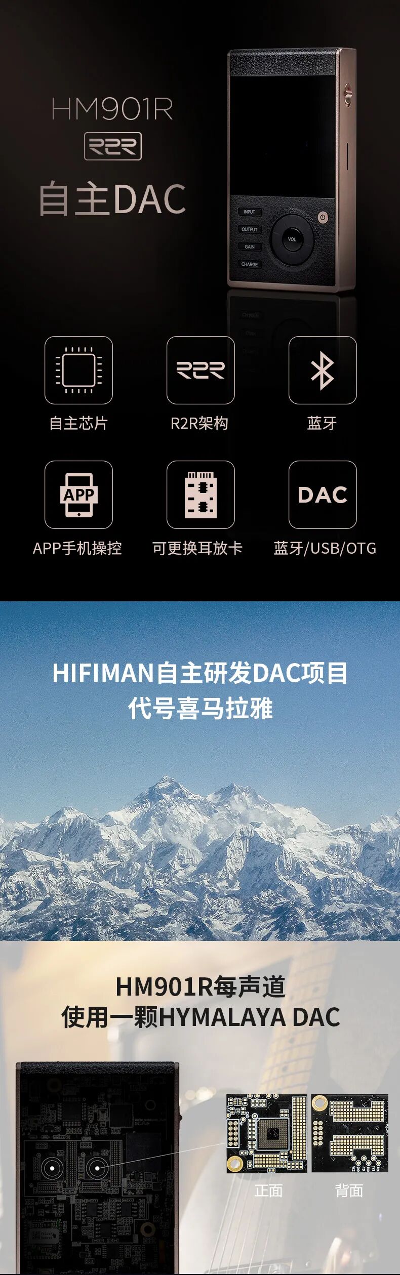 采用自主研发芯片HYMALAYA,R2R架构,可更换耳放卡,高清蓝牙,手机APP操控,支持蓝牙/USB/OTG DAC