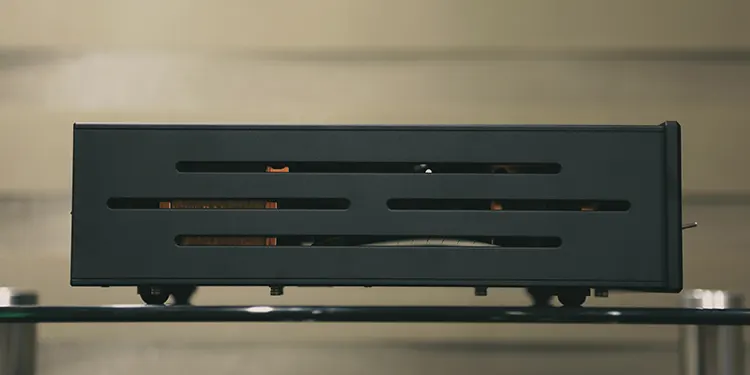 作为模拟放大器,需根据信号线长度合理摆放在DAC或音源附近。采用现代极简主义设计,通体黑色厚铝板包裹,仅前面板配有三个银色机械开关(电源/阻抗/输入选择)。白色标识字体间距合理,辨识度极佳。略微偏离中心位置的前面板模拟电位器配备超大音量旋钮,指槽设计兼具操控便利性与音量刻度指示功能。两侧及顶板采用密集型散热孔设计,左右侧散热孔甚至可窥见内部元件。与传统顶置电子管放大器相比,GA-10的管芯辉光更为含蓄。底部配备四枚可替换橡胶脚垫,(非机身一体式),即便在钢化玻璃表面也能稳固放置。