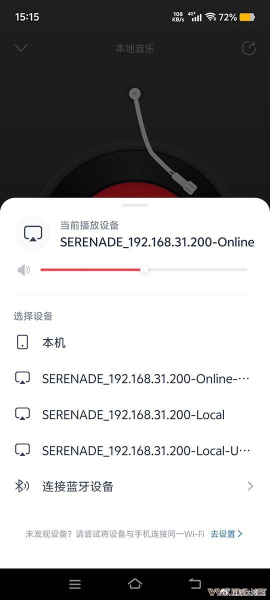1、首先要将机器连接有线网络,再用同一WiFi网络下的手机运行网易云音乐,播放界面点击左下角的“投屏”图标,就能看到SERENADE_192.168.*.*开头的几个设备;