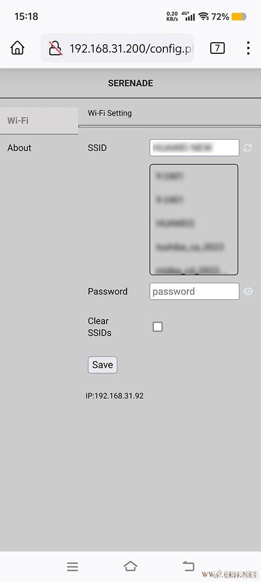 2、把IP地址192.168.*.*记下来,再打开手机浏览器,访问这个地址,就会出现填写路由器名称和WiFi密码的页面,填好信息按“Save”,存储信息完成后重启小夜曲WiFi版。