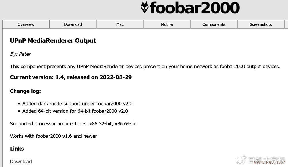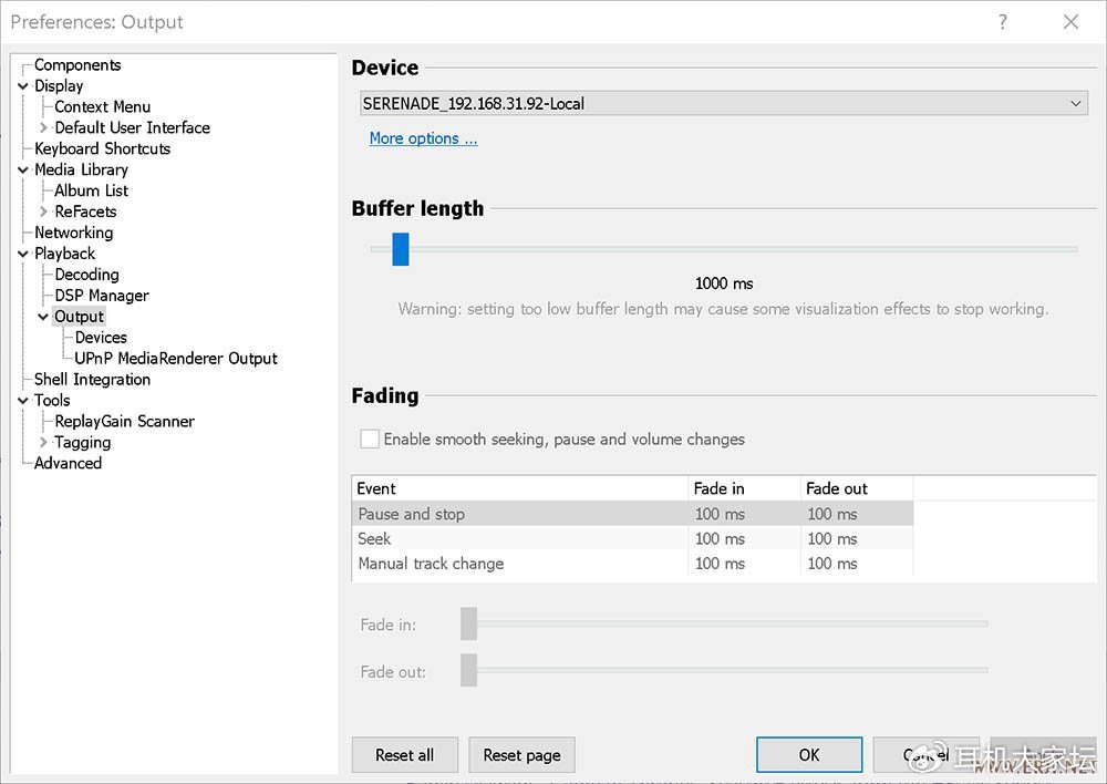 4、用连接有线网络的台式电脑播放到小夜曲WiFi版,必须用安装好“UPnP MediaRenderer Output”插件的foobar2000播放软件。安装好插件,foobar2000通过菜单:File--Preferences—Output 在Device选项里选择小夜曲WiFi版的设备名称即可(SERENADE_192.168.*.*-Local)。