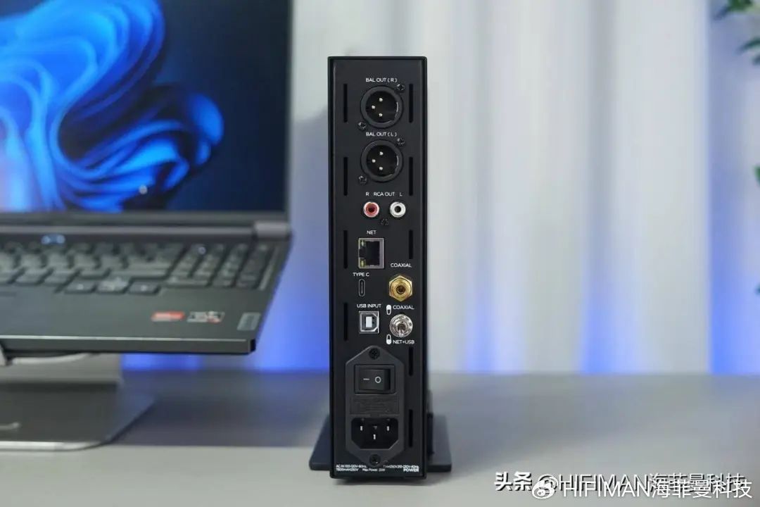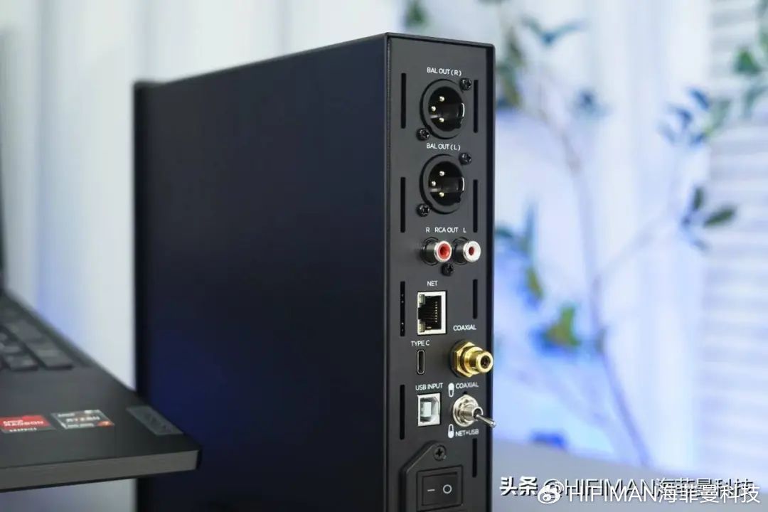 对比前面板的简约清晰,初见HIFIMAN EF499的后面板,多少有些目不暇接的感觉——这接口数量也太多了吧?从上到下数下来,首先是XLR平衡输出和RCA输出,接下来是Net网络流媒体、Type-C输入、同轴输入、USB-B输入,合共四种输入方式。
