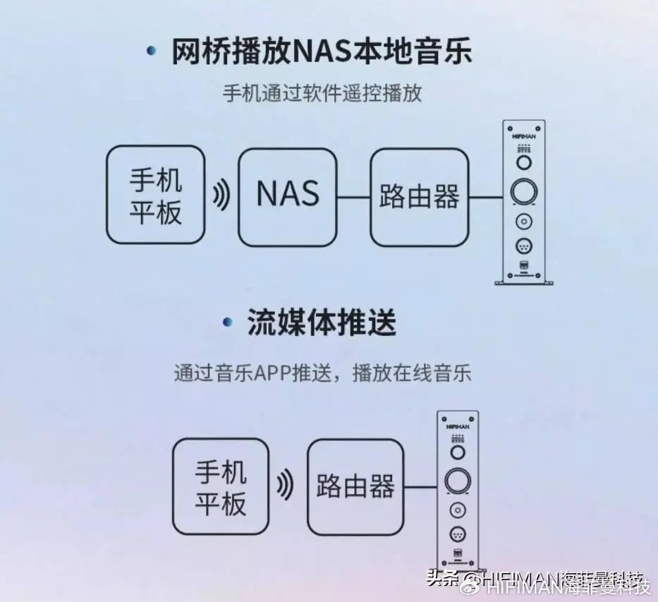顾名思义,网桥播放是指设备播放网络上的音乐,这些音乐既可以是存储在硬件上的音乐文件,也可以是流媒体音乐。如此调用,不仅发挥了网络传输的自由度和存储优势,而且可以使得播放设备的性能基本都只为播放服务,是一种更符合现如今使用环境的高音质做法。