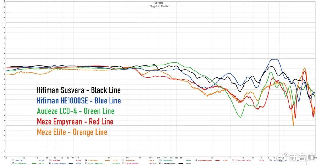 包括HiFiman的SUSVARA(黑色)、HE1000(蓝色)与几个旗舰产品Audeze LCD4(绿色)、Meze Empyrean(红色)、Meza Elite(橙色)的频率响应曲线对比,科学告诉我们HiFiman要更平直中性