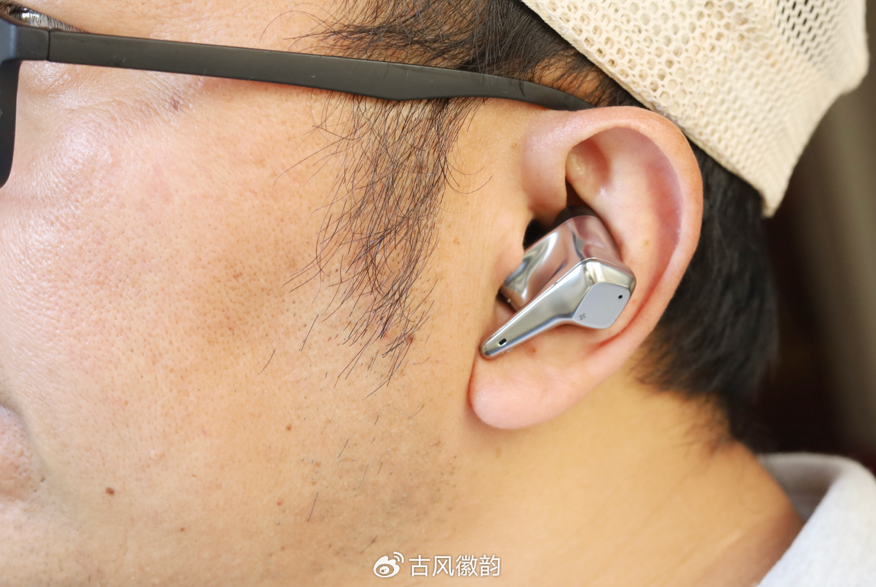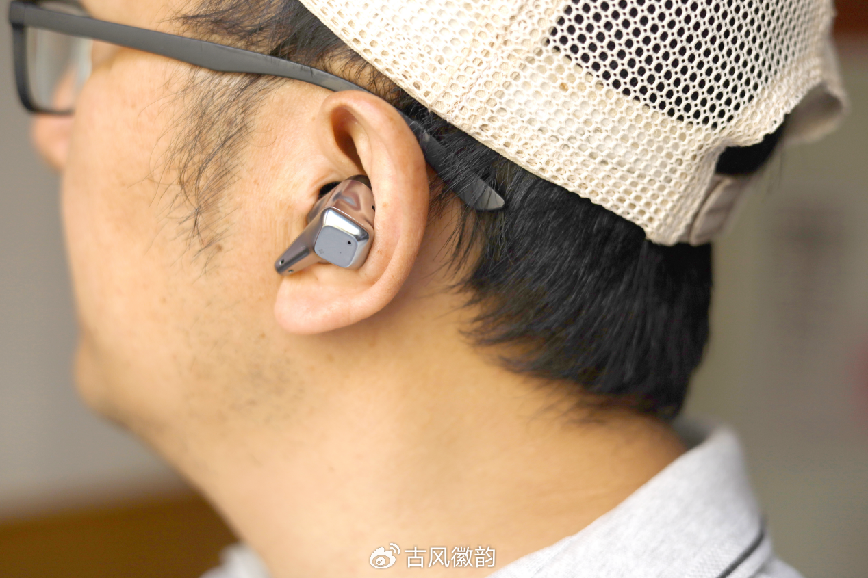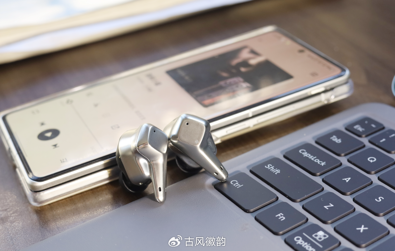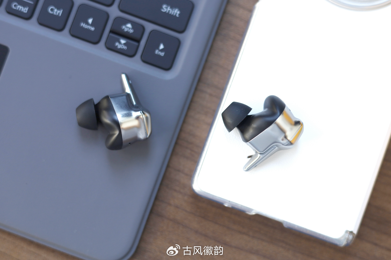 耳机依旧是多切面,棱角分明的造型设计,边缘打磨细致,加上与充电仓银色镶边相呼应的亮银色配色,延续了轻奢的风格,精致!