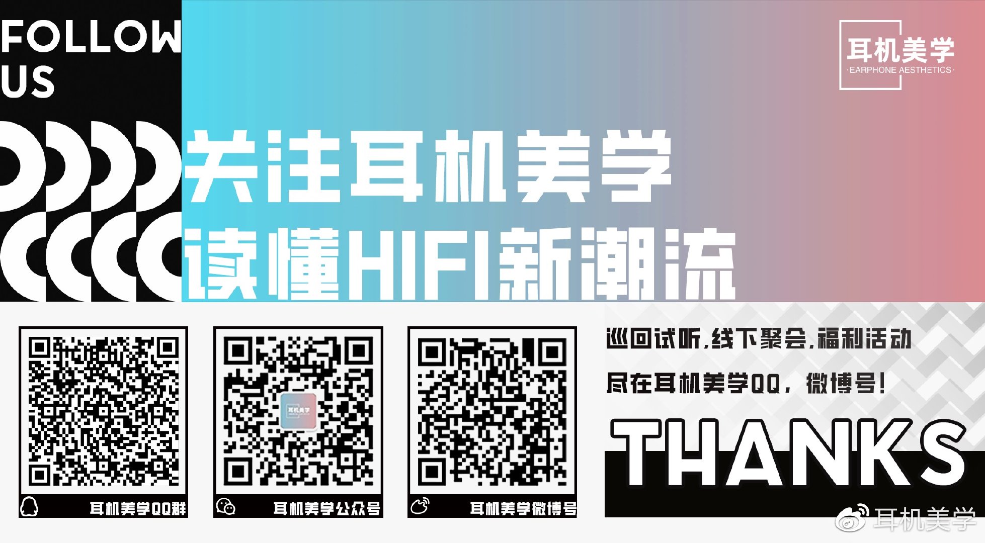 微信烧友交流群“耳机美学吹水群”,欢迎大家的加入,可以添加我个人微信私聊获取入群途径,加好友时请备注“烧友”。耳机美学QQ群和微博账号请扫描下方二维码。