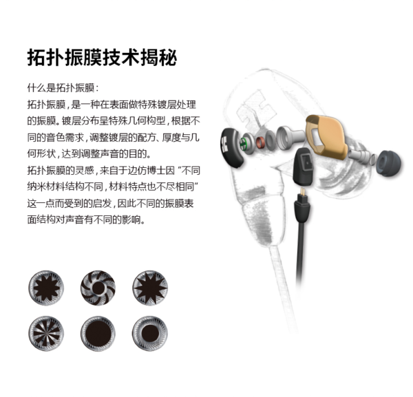 在既定的空间内,声音的结象还是清晰之余有着一定的柔和感,这也许是这两款单元所使用的拓扑振膜技术在声音刻画上的共性——不过要了解的是,拓扑技术是基于镀层分布呈特殊几何构型,可以根据不同的音色需求,调整镀层的配方、厚度与几何形状,达到调整声音的目的。也许我们以后听到的同样采用拓扑技术的耳机,声音会有截然不同的效果。